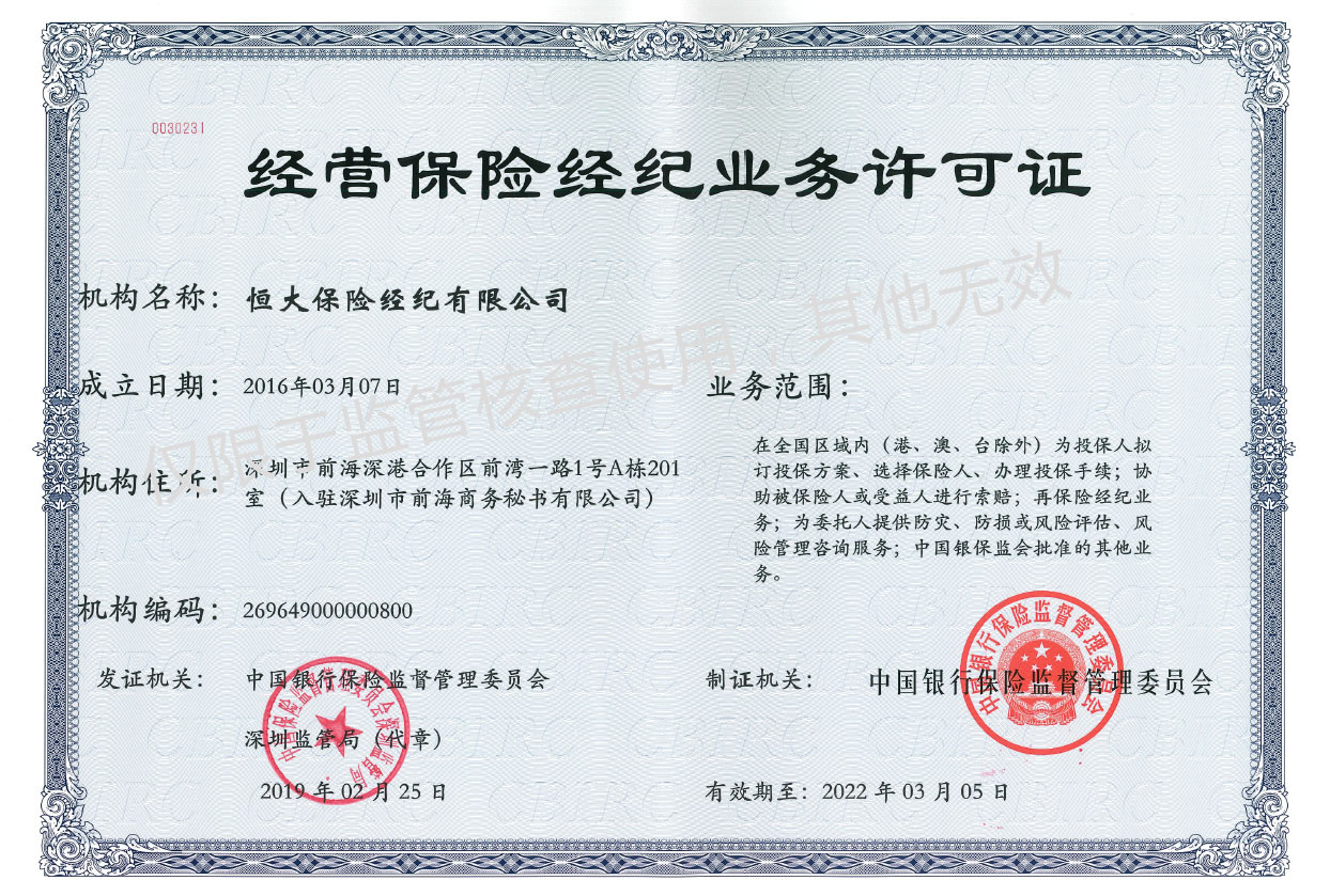 依据《保险法》第一百一十八条的规定,保险经纪人是基于投保人的利益,为投保人和保险人订立保险合同提供中介服务的机构。恒大保险经纪有限公司秉承“一次投保 · 终身服务”的经营理念,坚持科技驱动和资源协同战略,依托恒大集团雄厚的资本实力、多元的产业布局、广泛的合作渠道和庞大的上下游资源,为最广大消费者提供涵盖人身险、财产险全产品线的综合性保险经纪服务。